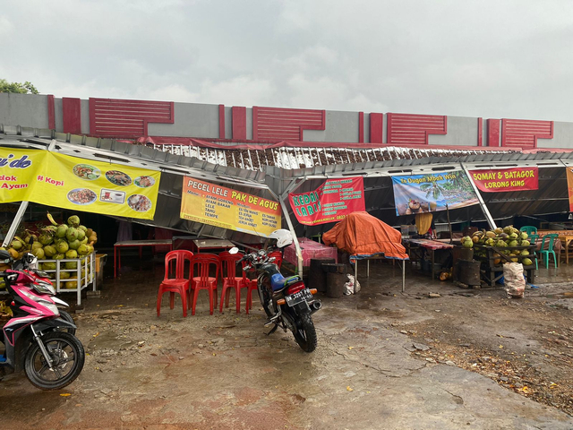 Lampung Geh, Bandar Lampung – Akibat hujan deras dan angin kencang, atap pedagang di pinggiran stadion Way Dadi Bandar Lampung ambruk, Jumat (13/8).