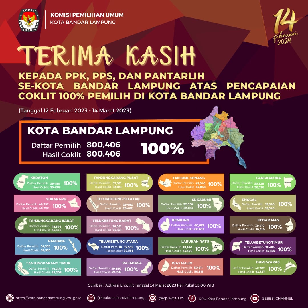Terhitung hingga Selasa (14/3) pukul 20.00 WIB progres coklit di Kota Bandar Lampung sudah rampung 100 persen.