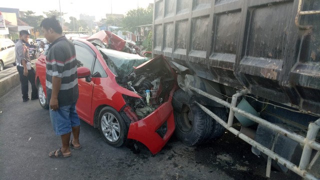 “Posisi mobil truck dump berjalan di depan kendaraan mobil Honda Jazz dengan posisi di lajur kiri jalan. Diduga mengantuk, pengendara mobil Honda Jazz yang lelah mengakibatkan bagian depan mobil Honda Jazz menabrak bagian belakang samping kanan mobil truk yang mengakibatkan terjadinya kecelakaan lalu lintas,” jelasnya.