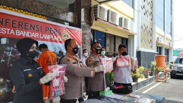 Konferensi pers yang langsung dipimpin Kapolresta Bandar Lampung Kombes Pol Ino Harianto di halaman Mapolresta mengenai ungkap kasus kedua tersangka yang mengakui baru satu bulan melakukan pengedaran barang haram tersebut.