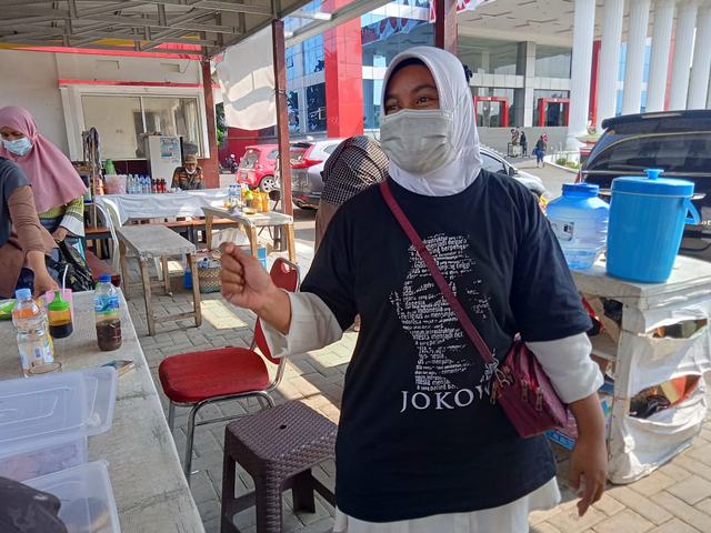 Kaos dengan motif sksetsa wajah Jokowi dan bertuliskan JOKOWI tersebut langsung dikenakan oleh Susianti sembari melanjutkan berdagang.