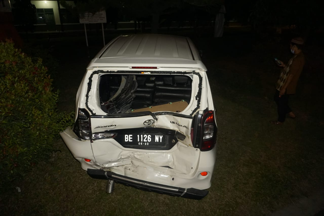 Tabrakan tersebut mengakibatkan kaca bagian belakang pecah dan terhambur di area putar balik. Sedangkan, mobil hilang kendali hingga masuk kawasan Detasemen Peralatan (Denpal) II/3 Lampung.