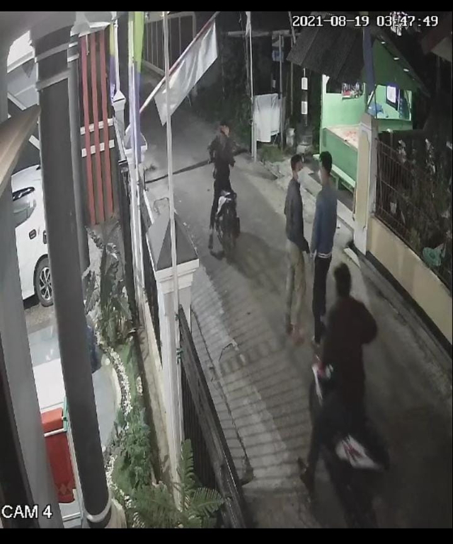 Keempat pelaku yang membawa sepeda motor milik Alvin (24) terekam kamera pengintai alias CCTV rumah warga.