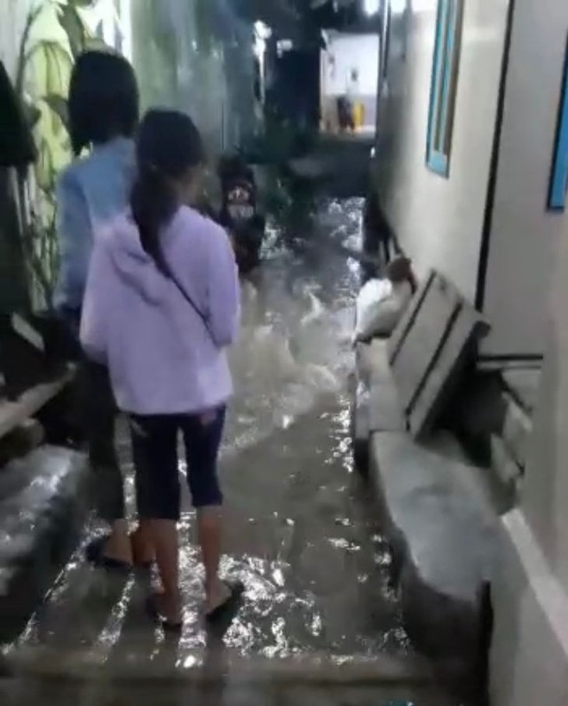 “Banjir lagi sampai depan rumah, ombaknya mulai naik,” ungkap salah seorang warga saat merekam video.